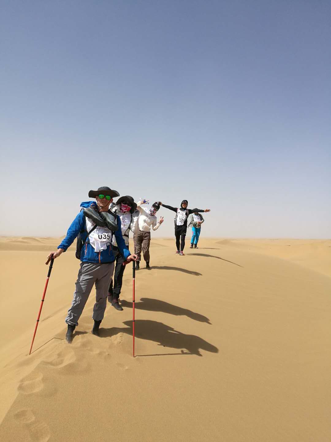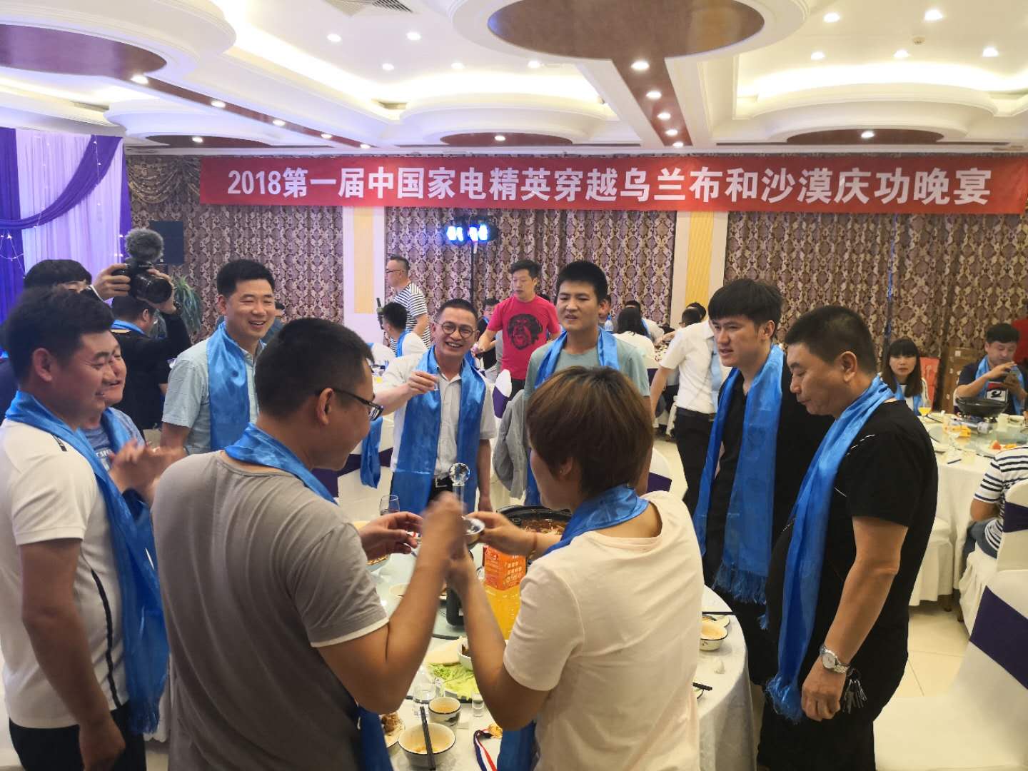 比赛当天,乌兰布和好似以它最热情的一面在迎接着家电精英们的到来,忽大忽小的春风一直刮着,却没有让家电精英们退缩,他们依旧迎风而来,挺进了乌兰布和腹地中的那一抹绿色—内蒙古精英户外运动有限公司的专属营地。当天最早抵达的参赛嘉宾仅在上午10:40就成功抵达终点营地,而最后抵达的队员也在12:00成功完成上半段赛场的挑战。搭建好的大帐静静在大漠腹地迎接着各位勇者。餐饮团队已经准备好了午餐,热气腾腾的羊肉粉汤、各类水果以及正宗的凉拌苦菜,家电精英们大快朵颐,吃的好不畅快。 简单的休整之后,中午13:30分,再次启程,这个时候的乌兰布和已经狂风肆虐,30多度的高温依旧无法抵挡家电精英们挑战未知的决心,发令枪声再次响起,我们再次出发。下半段的路程虽然不长,但是恶劣的天气加上路线中要求的大沙丘,仍旧让家电精英们措手不及,他们坚持着、努力着不肯放弃,最终在16:42分比赛完美收官。 虽然只有一天的比赛,却不乏令人感动的瞬间,本次比赛的参赛嘉宾中,有一对年龄近50岁的夫妻,他们在过程中一直手牵手,相互鼓励、相互支持,即使已经在队伍的最后,仍旧不放弃,他们手牵着手走向了终点,那一刻,感动了我们所有人。 晚上19:00,庆功晚宴正式开始,之前提到的那一对夫妻依旧是手牵着手,上台分享了他们的感受,也许,这就是沙漠的魅力,也许,这就是沙漠徒步、挑战未知带给我们的感悟与心灵冲击吧。
